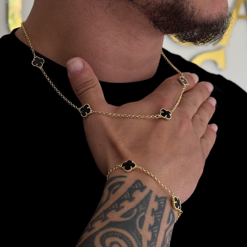 Pulseira Elo Português 2mm Trevo Ônix Banhado A Ouro 18k
